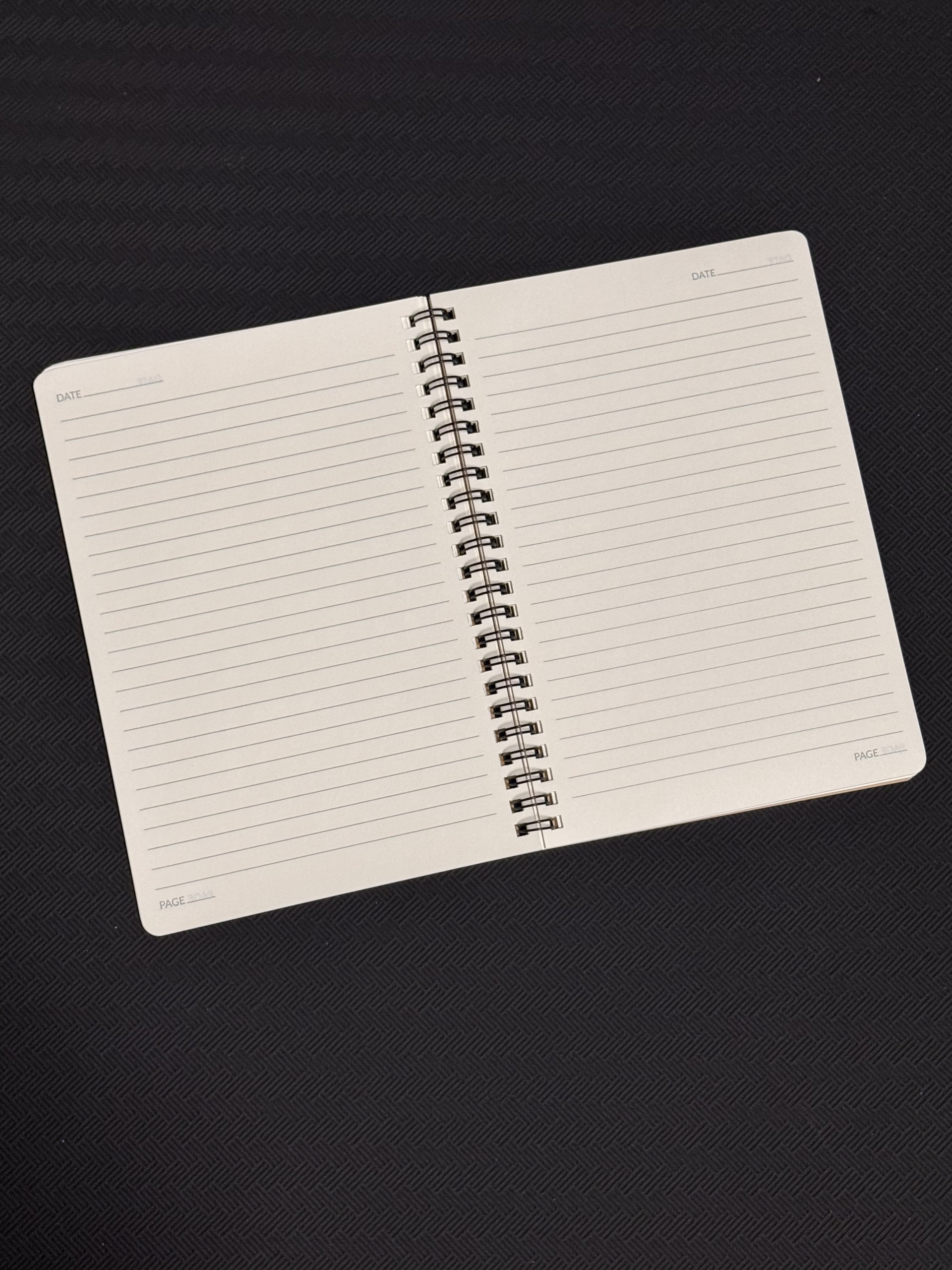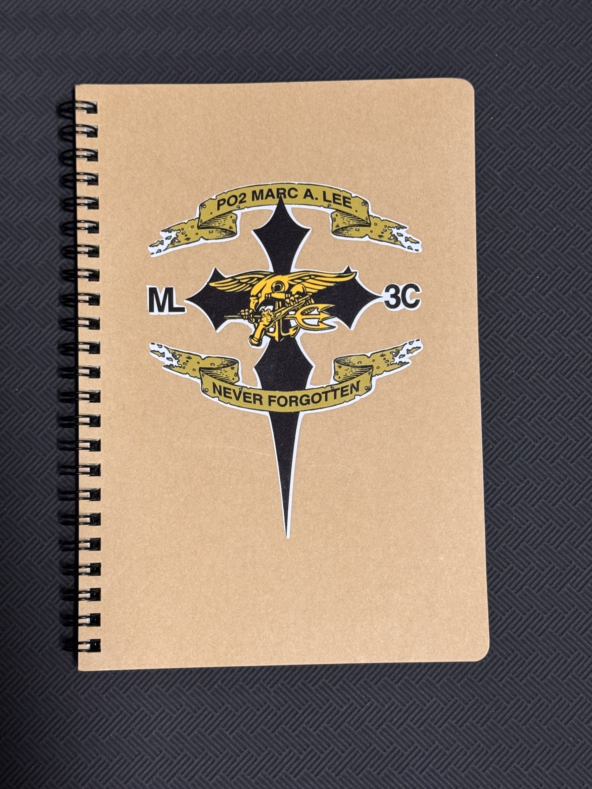 Spiral bound notebook, Marc Lee decal on front cover. Includes lined pages front and back inside.